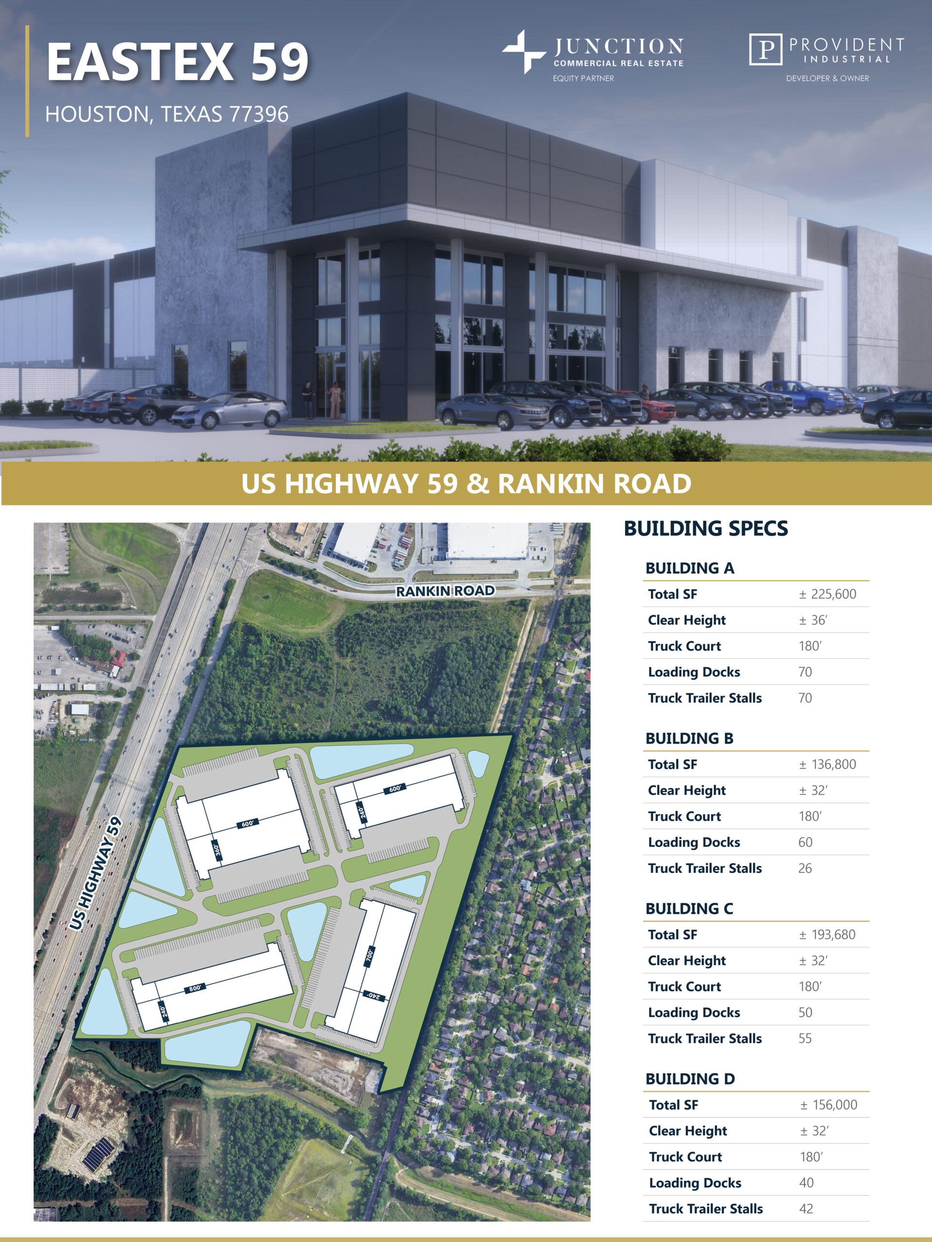 Eastex 59 is a new, ± 712,080 SF industrial distribution park located in North Houston, Texas. Strategically located with direct access and frontage on Highway 59, the site provides occupiers a variety of size ranges from 50k-225k SF plus a lower occupancy cost solution in City of Humble which boasts one of the lowest overall tax rates in the Houston MSA (1.92%). The proposed project also features ample auto parking, trailer storage, ideal circulation, and coveted frontage/visibility on a major thoroughfare to appeal to current tenant demands. Eastex 59 presents a unique opportunity to invest in an institutional quality development in a top performing submarket.